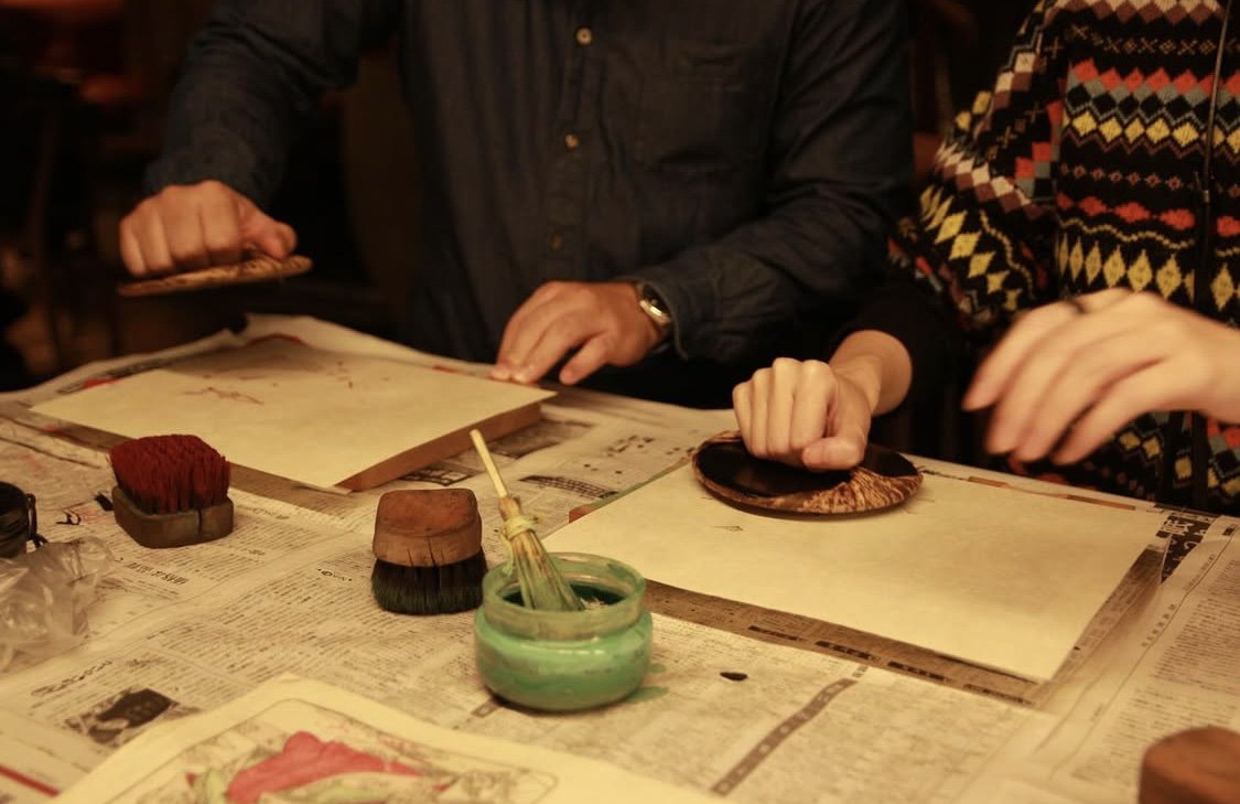 実際の浮世絵制作と同じ工程で、一枚一枚、手で摺る体験をしていただけます。